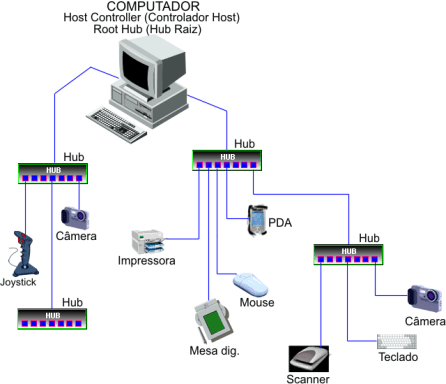 A topologia do USB permiti conectar múltiplos Hubs, chegando ao número teórico de até 127 funções conectadas a mesma porta USB.