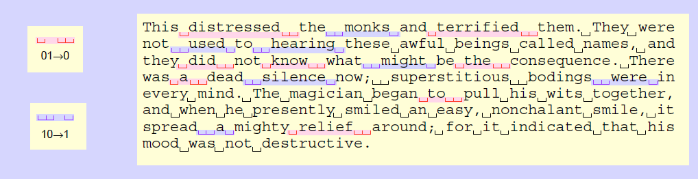 Estes métodos costumam produzir bons resultados, pois raramente a alteração do número de espaços de um texto altera seu significado e é pouco provável que um leitor perceba modificações realizadas nos espaços em branco. Uma das formas de utilizar os espaços em branco para esconder uma mensagem envolve a justificação do texto. Com o texto justificado, a quantidade de espaços entre as palavras são utilizadas para codificar a mensagem a ser escondida. Um espaço entre palavras é interpretado como “0” e dois espaços são interpretados como “1”. Como a justificação do texto impõe algumas restrições, nem todos os espaços podem ser utilizados para codificar um dado. Assim, o seguinte esquema é utilizado na codificação: “01” é interpretado como “0”, “10” é interpretado como “1” e tanto “00” quanto “11” são ignorados. A figura abaixo ilustra a utilização deste método.