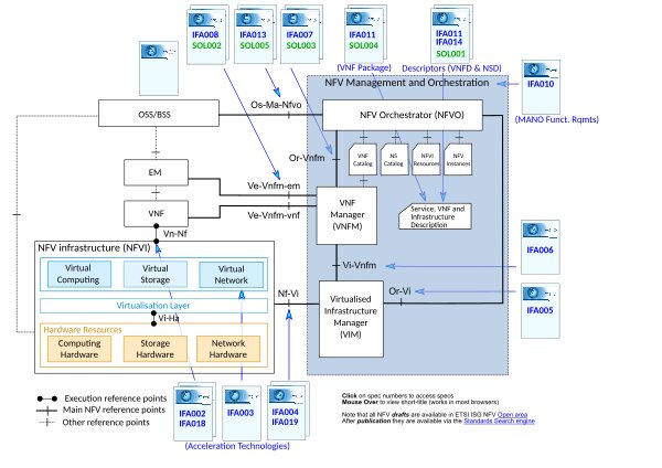 - EM: Geralmente acompanham as VNFs, gerenciando as funções da VNF (FCAPS: Fault, Configuration, Accounting, Performance and Security).