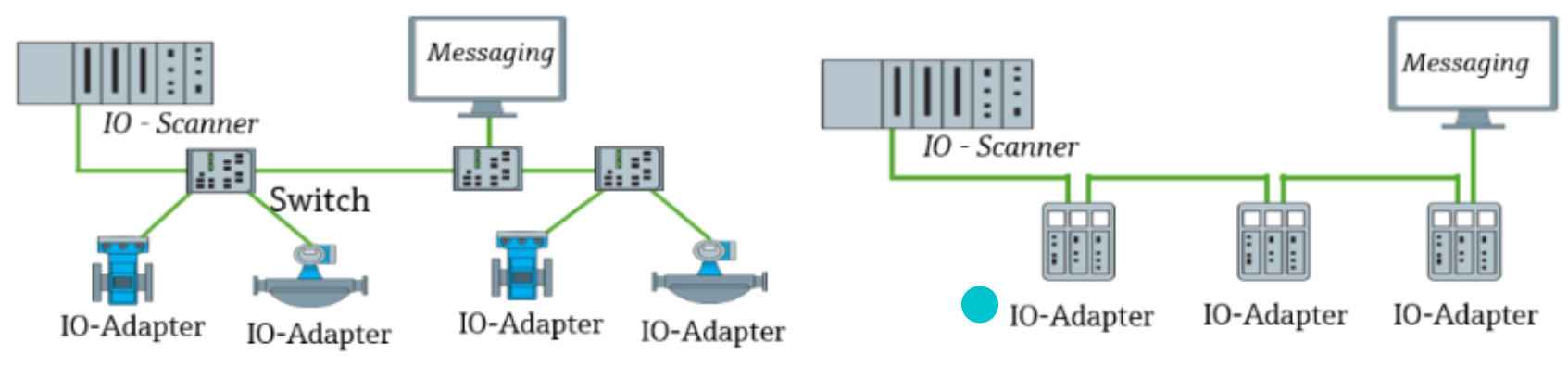 O EtherNet/IP usa Ethernet e switches padrão, portanto, pode ter um número ilimitado de nós em um sistema, permitindo uma rede em muitos pontos finais diferentes em um chão de fábrica, e também permite comunicações peer-to-peer de escravos muito eficientes. No entanto, para oferecer suporte à comunicação em tempo real e evitar latência, é necessário limitar a arquitetura da rede.
