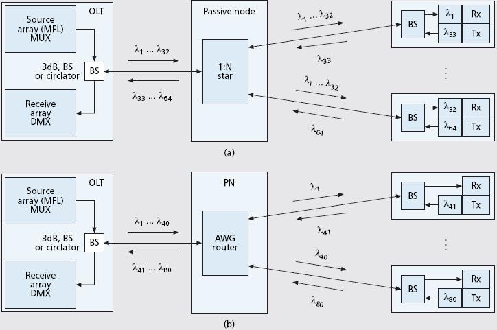 - Uso de um Arrayed Waveguide Grating (AWG), equipamento passivo que funciona como um roteador de comprimentos de onda, ele recebe um sinal com vários comprimentos de onda e os separa em diferentes saídas. Nesse esquema o AWG faz o encaminhamento dos comprimentos de onda para a ONU correspondente. A Figura 9 e a Figura 10b utilizam um AWG.