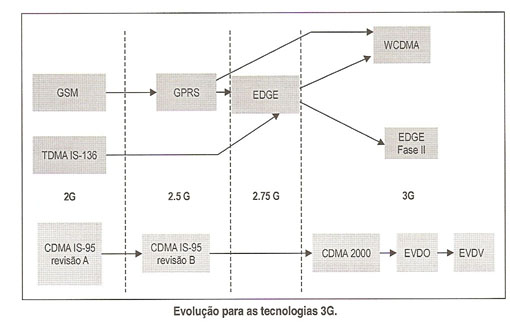 A segunda geração de celulares evoluiu para a chamada 2.5G, que incluía o serviço GPRS (para o padrão GSM) e a revisão do sistema CDMA IS-95. Na evolução seguinte, para a chamada 2.75G, o GPRS evoluiu para o sistema EDGE, que estudaremos mais a frente. Na terceira geração, o CDMA IS-95, ainda da geração 2.5G, evoluiu para CDMA 2000, e depois para EVDO e EVDV em seguida. O sistema EDGE evoluiu, num sentido para EDGE fase 2, e, em outro, para WCDMA.