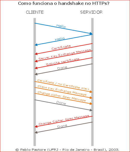Primeiramente, o cliente envia ao servidor sua versão do SSL, configurações de cipher, informação gerada randomicamente e outras informações que o servidor precisa saber.