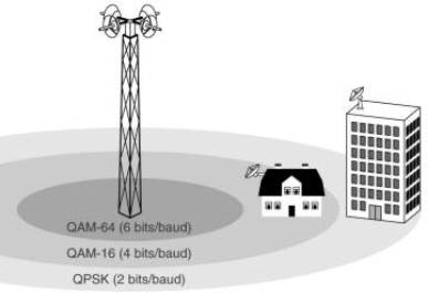 Como a intensidade do sinal na banda milimétrica cai com a distância da estação-base, a relação sinal/ruído também cai com a distância da estação. Por essa razão, o 802.16 emprega três esquemas de modulação diferentes, dependendo da distância a que a estação do assinante se encontra em relação à estação-base. Para assinantes próximos, é usado o QAM-64, com 6 bits/baud. No caso de assinantes situados a uma distância média, é usado o QAM-16, com 4 bits/baud. Para assinantes distantes, é usado o QPSK, com 2 bits/baud. Por exemplo, para um valor típico de 25 Mhz de espectro, o QAM-64 oferece 150 Mbps, o QAM-16 oferece 100 Mbps, e o QPSK oferece 50 Mbps. Em outras palavras, quanto mais distante estiver o assinante em relação à estação-base, mais baixa será a taxa de dados.