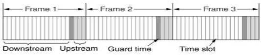 Como exemplo pode-se imaginar que a estação-base transmite quadros periodicamente. No qual cada quadro contém slots de tempo, os primeiros se destinam ao tráfego de downstream. Em seguida, há um tempo de proteção (denominado tempo de guarda) que é utilizado pelas estações para comutar o sentido e por fim, tem-se os slots para tráfego upstream.