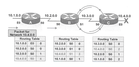 Ocorre, porém, uma falha e a rede 10.4.0.0 não está mais disponível. O roteador C, diretamente conectado a esta rede, detecta a falha e para de enviar pacotes para ela. Porém, os roteadores A e B ainda não receberam o aviso de que a rede 10.4.0.0 caiu. O roteador A, ainda acredita que pode acessar esta rede através do roteador B (sua tabela de roteamento continua a marcar uma distancia de 2 saltos até ela).
