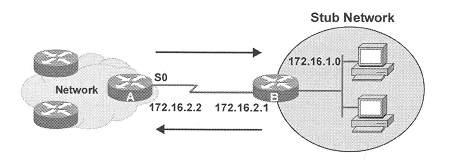 UTILIZAÇÃO Quando devem ser utilizados (rotas estáticas x rotas dinâmicas)? Existem duas maneiras de se configurar um roteador para "ensina-lo" como transmitir um pacote para uma rede que não está diretamente conectada a ele. Pode-se utilizar rotas estáticas ou rotas dinâmicas (esta, utiliza protocolos de roteamento). Na rota estática é necessário que o administrador diga para o roteador como chegar a uma dada rede. Sempre que houver alterações na rede o administrador deve manualmente fazer as atualizações no roteador. A simples adição de uma nova rota, exigiria a alteração das tabelas de roteamento em todos os roteadores da rede. Com isso é possível ver que a configuração manual das tabelas de roteamento é um método que somente se aplica a pequenas redes, com um número reduzido de roteadores e de rotas. Por outro lado, rotas configuradas manualmente permitem que se tenha um controle bem preciso sobre o comportamento de roteamento desta rede IP. Já nas rotas dinâmicas, o roteador dinamicamente aprende rotas (uma vez que o administrador configurou um protocolo de roteamento nele). Diferente das rotas estáticas, após o administrador configurar o roteamento dinâmico, o roteador automaticamente atualiza suas rotas sempre que alguma mudança na rede for informada. Os roteadores aprendem e mantém suas tabelas de roteamento atualizadas através da troca de pacotes de atualizações entre eles. Rotas estáticas são bastante utilizadas em redes stub e como gateways de saída para onde todos os pacotes com destino desconhecido serão mandados. Denomina-se rede stub, uma rede acessada por um único roteador como na figura abaixo.