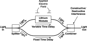 A luz é dividida no divisor (splitter) em duas fibras. A luz na fibra de baixo experimenta um atraso fixo enquanto a de cima pode ter seu atraso controlado variando o índice de refração do cristal, aplicando um campo ao mesmo, ou seja, variando a velocidade em que a luz trafega pelo cristal. Desta forma, no acoplador na saída teremos interferências construtivas ou destrutivas, dependendo do campo elétrico aplicado no cristal.