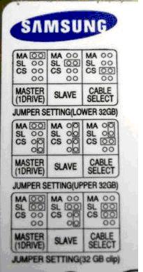 Todas as unidades de disco IDE têm um bloco de jumpers localizado entre o conector de 40 pinos e o conector de alimentação. Esses jumpers selecionam as opções de detecção física na unidade de disco rígido. Na tabela da esquerda é possível encontrar o significado das configurações. O HD está configurado, na foto, como master. A tabela serve para configurar, também, discos com capacidade maior do que 32 GB. O problema, neste caso é que estes discos não são reconhecidos pelas controladoras mais antigas instaladas nos computadores, nesta situação deve-se empregar apenas a parte inicial de 32 GB do disco, ficando a capacidade acima destes 32 GB inaproveitada.