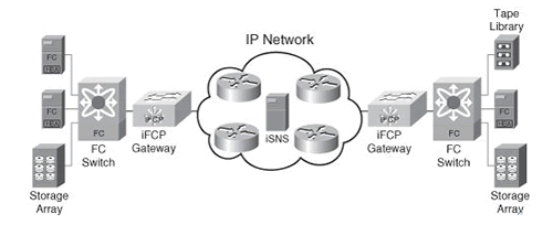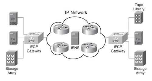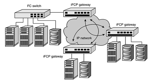 Na outra forma, os iFCP Gateways substituem os FC switches, e são ligados diretamente aos dispositivos Fibre Channel, Figura 2.21. Com isso, é possível criar soluções SAN baseada em IP que usem dispositivos do Fibre Channel, mas que não requerem FC Fabric.