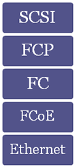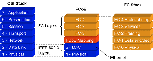 O FCoE fornece a capacidade de carregar a camada FC-2 sobre a camada Ethernet, como na Figura 2.25. Isso permite o Ethernet transmitir as camadas FC-3 e FC-4 através das camadas IEEE 802.3 do Ethernet. Esse mapeamento feito pelo FCoE que permite o tráfego FC passar pela infra-estrutura Ethernet.