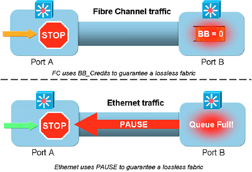 Entretanto, controle de fluxo descarte de pacotes não é aceitável, pois há perdas de informações. Contudo, o IEEE 802.3X Ethernet contém um função conhecida como PAUSE. Essa função permite que se uma porta receptora estiver ocupada, ela possa enviar um quadro de controle para a porta de transmissão a fim de dar um intervalo na transmissão, Figura 2.28. Essa função Pause do Ethernet permite que o tráfego Fibre Channel passe pela rede Ethernet sem que ocorra perdas.