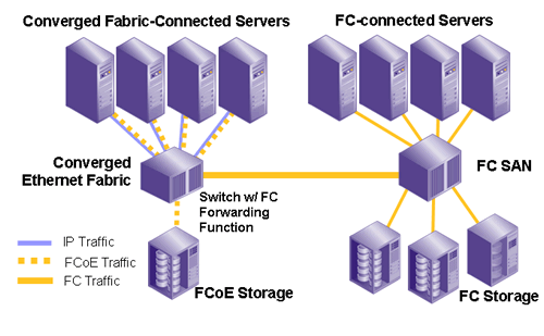 Atualmente, as empresas mantém duas redes, uma para LAN, baseada no Ethernet, e outra para SAN, baseada no Fibre Channel. Convergir as duas redes em uma única infra-estrutura Ethernet permitirá a consolidação I/O. Num mesmo cabo físico poderá passar tráfegos poderá passar tráfegos FC e da Ethernet, Figura 2.24.