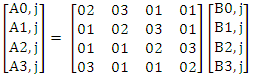 Onde Bi,j corresponde à coluna j de bytes de entrada e Ai,j corresponde à coluna j de saída da operação. Desta forma, o elemento A0,j por exemplo corresponde a: