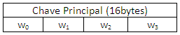As Nk primeiras chaves, que são usadas na rodada 0, são formada pela simples divisão da chave principal (128bits = 16 bytes) em Nk chaves menores de 4 bytes cada uma.