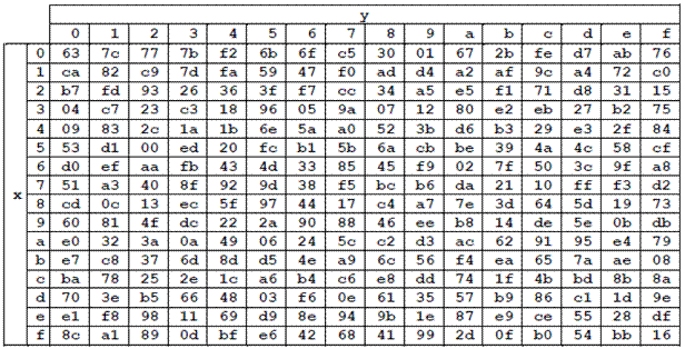 Assim, dado um byte representado por 2 dígitos hexadecimais xy, a substituição é dada de acordo com a tabela: