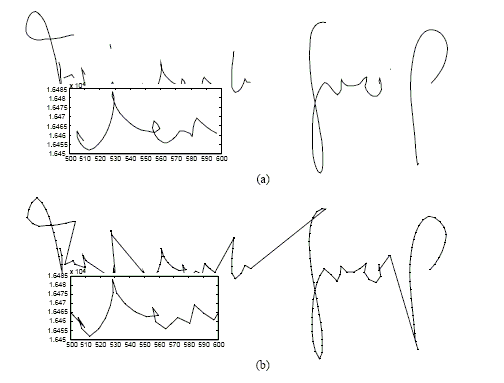 (a) Imagem de uma assinatura antes do pré-processamento. Os pontos de amostragem são espaçados igualmente no tempo.