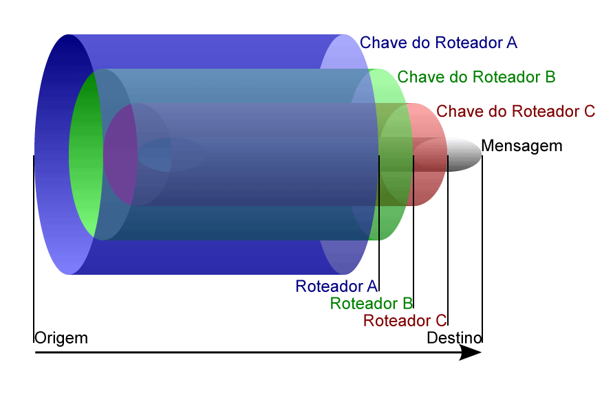 O Nome onion, ou cebola, remete ao modo de transmissão dos pacotes de dados pela rede TOR, chamado de onion routing ("roteamento cebola"). O cliente TOR que esta enviando a mensagem seleciona um caminho de roteadores na rede e encripta a mensagem diversas vezes (usando encriptação assimétrica) e, a cada servidor, o pacote recebido (a cebola) é desencriptada, ou seja, uma camada do pacote é retirada, como uma cebola sendo descascada, e um novo caminho randômico pode ser escolhido. Assim apenas o remetente, o ultimo servidor e o receptor veem a mensagem original.