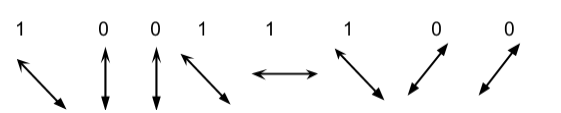 Alice atribui para cada base uma direção como 0 e a outra como 1. Em seguida, ela envia essas escolhas a Bob como texto simples. Por exemplo, supomos que Alice escolheu a direção vertical como 0 e a direção horizontal como 1, além de escolher do canto inferior esquerdo até o canto superior direito como 0 e do canto superior esquerdo até o canto inferior direito como 1. O próximo passo é escolher uma chave única para ser transferida, bit por bit, para Bob. Para cada bit, Alice escolhe uma de suas bases ao acaso. Para enviar um bit, sua pistola de fótons emite um fóton polarizado conforme a base que Alice escolheu para este bit. Na figura 3.1, Alice está enviando a chave 10011100 para Bob, tendo escolhido como bases, em ordem: diagonal, retilínea, retilínea, diagonal, retilínea, diagonal, diagonal e diagonal. Apenas lembrando: bits enviados um fóton de cada vez são chamados QBits.